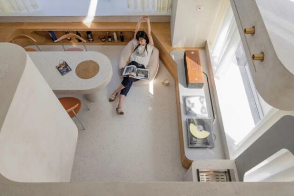 被隔出的二层空间有开放式卧室、卫生间,还有一张书桌兼化妆台,满足了刚刚踏入职场的女孩的需求。二层卧床的下方是沙发区,两侧与顶部都有遮蔽,非常有安全感。坐在这儿的时候,冰冰感觉就像在船舱里。现在,这个40㎡的小房子已经成了冰冰的小天地,她在这里接待了很多朋友,当然,父母是她最重要、最欢迎的客人