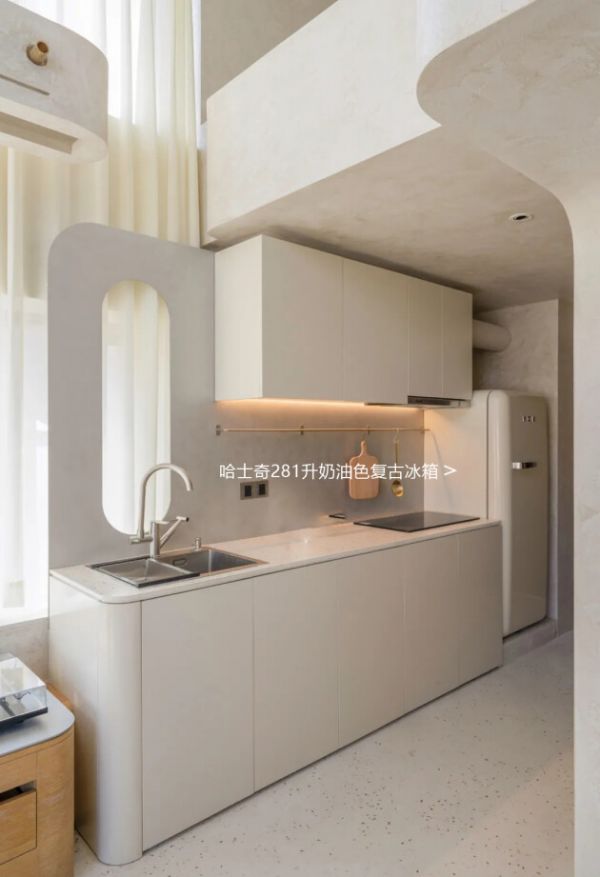 厨房的橱柜后侧有一面定制的金属挡板,涂上了同款奶油土色,既能适当阻隔油烟,也进一步丰富了层次。家电的搭配也是非常符合主题,同样是奶油色的哈士奇复古冰箱,曾经一度卖断货,也是冰冰坚持等了一个多月才买到手。作为家中最大的电器,最后发现尺寸却非常的合适,简约圆润的线条呼应着整个空间。