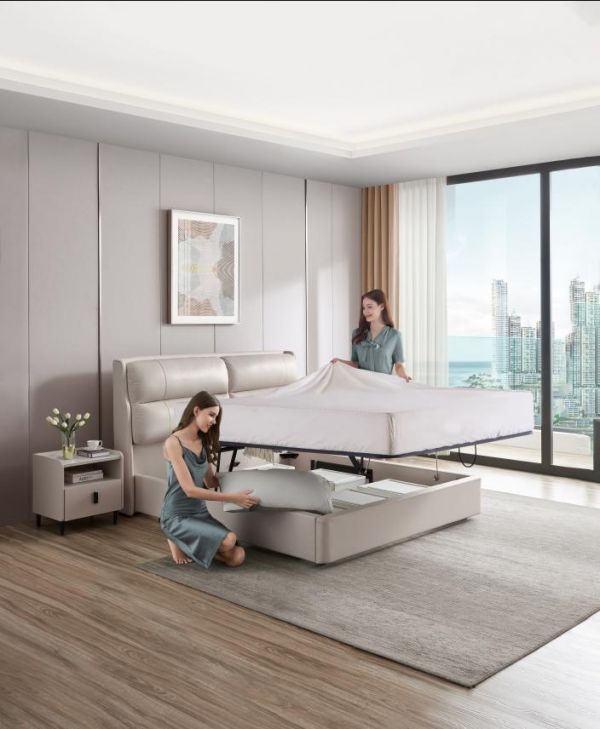 芝华仕储物真皮床C078采用自主研发的平移储物技术,即使自己一个人也可以轻松换床单,无死角打扫床底卫生;也可以和孩子一起把不穿的衣物或者孩子的玩具收纳床底,为一家人提供更大的亲子空间。