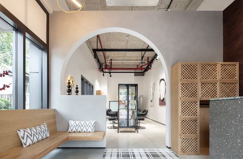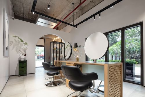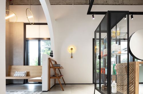 基于前面对功能的梳理和整合,整个空间是有序和条理的,因此它们需要可视化的场景来让顾客产生独特的体验感。设计师产生了“探索”这个keyword。探索是一个动词,怎样变成一个可描述的静态化的名词?设计师联想到钥匙,进而将半圆形的钥匙孔转换成设计语言,首先应用在一层接待区与发型师的间断结构,“探索”从这里展开。然后从一层到二层再到夹层,半圆形最终再次出现在螺旋楼梯的结束处,含义是探索的结果是不断学习与自我更新。