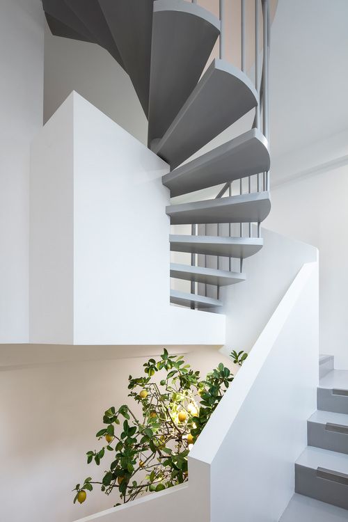 从一层入口开始,要阻断狭长“走道”的感觉,首先在入口处辟出视线相对独立的招待区,产生玄关的感觉。往后是集中于中央的发型师工作位,让空间饱满、紧凑,再往后是洗头区和楼梯。然后,将U形的楼梯中空位置在一层设置一个两个步级的基座,第一个步级是茶水操作台,对上高一个步级放置了往上生长的柠檬树,利用楼梯顶部的窗户引入自然光线,通过柠檬树在空间产生丰富的光影效果,这样的处理手法有别于常规放置大吊灯的做法。客人上楼的过程被柠檬树和光影形成的画面所吸引,忘却了过程出现的疲劳感。