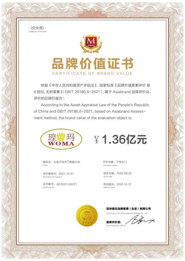 “瑝玛木门”凭借品牌实力和创新引领性,以品牌价值1.36亿荣获“品牌价值证书”!