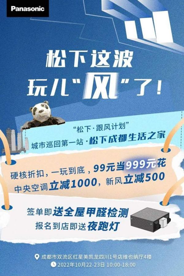 松下将不断抓住新机遇,丰富人们的家庭和工作生活,为行业发展提供更多可能。10月22-23日,松下跟风计划城市巡回首站在成都生活之家扬帆起航,一场为用户美好生活打造的新风潮也将正式拉开帷幕。