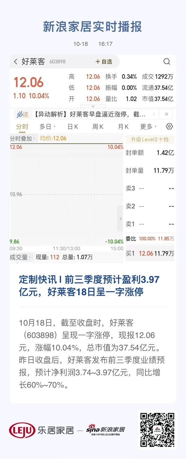 新浪家居定制频道讯 10月18日,截至收盘时,好莱客(603898)呈现一字涨停,现报12.06元,涨幅10.04%,总市值为37.54亿元。昨日收盘后,好莱客发布前三季度业绩预报,预计净利润3.74~3.97亿元,同比增长60%~70%。