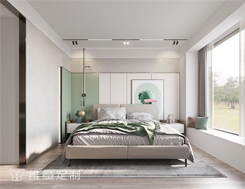 L型背景墙简约而有层次,钢管壁灯充满质感。气质满满私密天地,让你卸下疲惫与防备,安谧入睡。