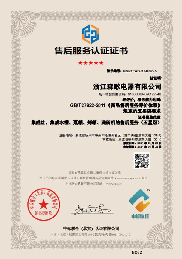 消费升级的时代,好产品必不可少,同样好服务更是不可或缺,在当代社会中,优质的服务已经成为品牌俘获人心的重要突破口。森歌的企业使命为“让厨房生活更有品质”,即包括让产品更有品质、让服务更有品质等内涵。森歌始终将消费者的使用体验放在首位,制定标准化服务流程,为“用户价值新创造”,塑造高端服务形象,赢得了广大消费者的高度认可和支持。森歌荣获了五星级售后服务认证,受到行业和消费者的一致好评,同时,森歌也荣获“全国售后服务行业十佳单位”和“全国顾客满意行业十大品牌”,森歌强劲的品牌号召力和影响力由此可见一斑。