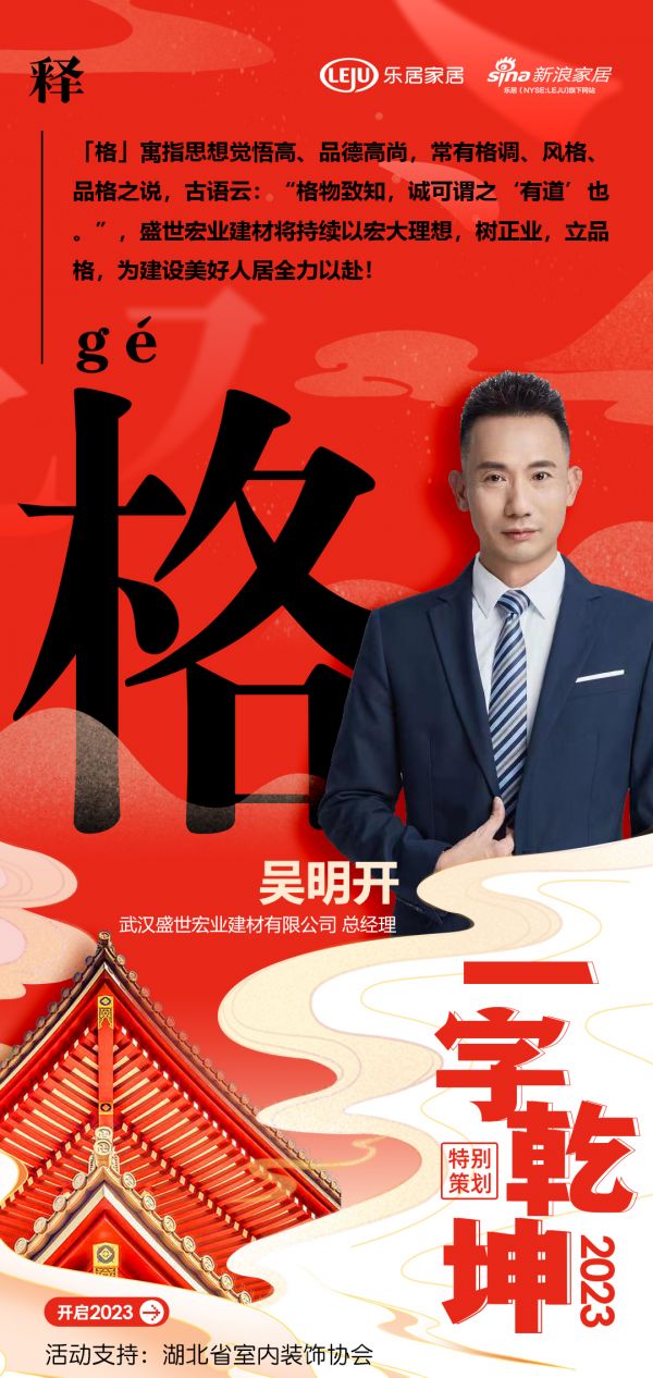 在新浪家居“2023一字乾坤”活动中,武汉盛世宏业建材有限公司总经理吴明开:「格」寓指思想觉悟高、品德高尚,常有格调、风格、品格之说,古语云:“格物致知,诚可谓之‘有道’也。”,盛世宏业建材将持续以宏大理想,树正业,立品格,为建设美好人居全力以赴!