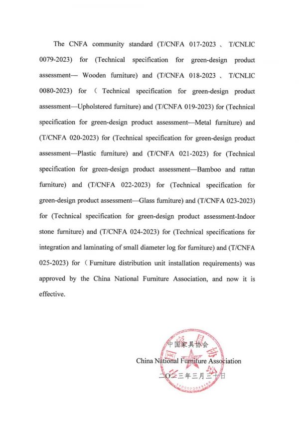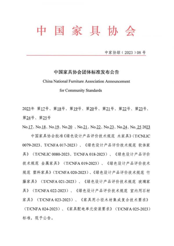 2023年4月21日,中国家具协会发布公告,表明中国家具协会批准《绿色设计产品评价技术规范木家具》、《绿色设计产品评价技术规范 软体家具》、《绿色设计产品评价技术规范金属家具》、《绿色设计产品评价技术规范塑料家具》、《绿色设计产品评价技术规范竹藤家具》、《绿色设计产品评价技术规范 玻璃家具》、《绿色设计产品评价技术规范室内用石材家具》、《家具用小径木材集成复合技术要求》、《家具配电单元安装要求》标准。