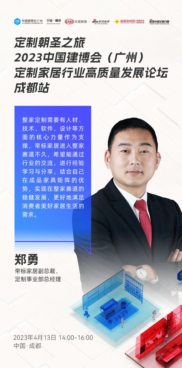 帝标家居副总裁、定制事业部总经理郑勇:整家定制需要有人材、技术、软件、设计等方面的核心力量作为支撑,帝标家居进入整家赛道不久,希望能通过行业的交流,进行经验学习与分享,结合自己在成品家具矩阵的优势,实现在整家赛道的稳健发展,更好地满足消费者美好家居生活的需求。