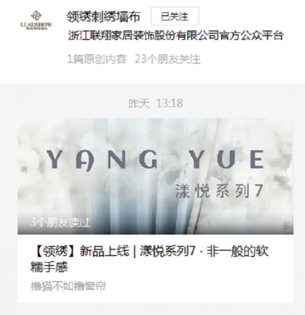 品牌在经营中需要更多被看见的机会,自媒体不仅仅是品牌的一个“官宣”平台,更是品牌多维度的输出渠道。领绣墙布积极搭建自媒体矩阵,主要通过微信公众号、抖音、小红书等热门平台向市场输送上市企业的品牌价值,精细化策划输出品牌内容,进一步扩大品牌影响力。尤其是领绣刺绣墙布公众号,长期保持高质量的稳定输出,以优质内容为抓手获取精准流量,打造品牌自由流量池,能够帮助品牌进一步完成商业闭环,提高变现能力。
