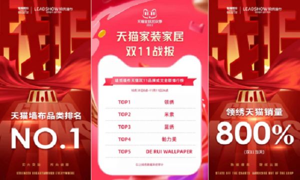 领绣墙布搭建线上销售平台,实现了从流量聚集到销售转化的闭合链路。在去年正式上市前夕,领绣墙布实现了与天猫家装本地化战略合作,在半年后的双十一硬战中获得了全面胜利:领绣墙布天猫焕新装修榜榜一、天猫双十一墙纸墙布品类总销量第一、领绣天猫双十一当天销量同比增长800%、全网墙布品类曝光量第一……除此之外,领绣墙布还收获了抖音单场浏览量同比增长1818%、抖音直播单场观看人数59967、抖音平台分时段流量3000+、抖音销量同比增长300%、墙布品类抖音粉丝量排名第一的优秀成绩!