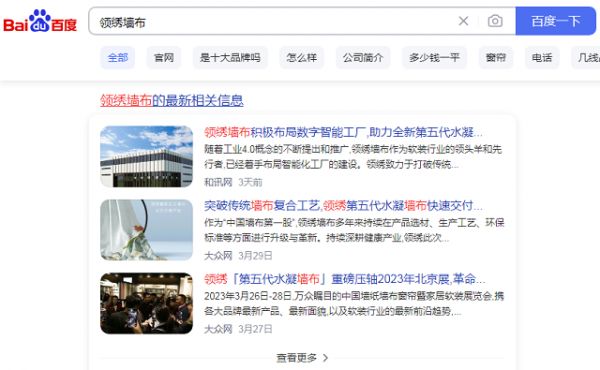 作为国内家居软装行业的标志性品牌,领绣墙布早已开始关键词的搜索运营,在搜索引擎上打造品牌内容的高频曝光和良好口碑。通过权威媒体、百度百科等平台和渠道,持续输出高质量内容,为品牌提供权威背书,提升经销商的加盟信心和消费者的购买信心。