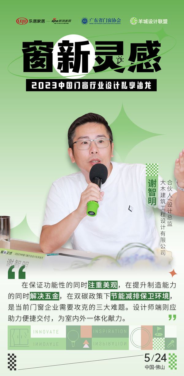 大木建筑工程设计有限公司合伙人/设计总监 谢智明 :在保证功能性的同时注重美观,在提升制造能力的同时解决五金,在双碳政策下节能减排保卫环境,是当前门窗企业需要攻克的三大难题。设计师端则应助力便捷交付,为室内外一体化献力。