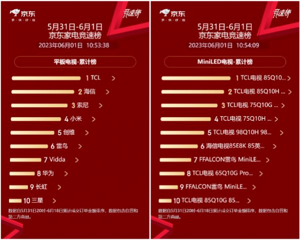 综上所述,618选购电视时了解普通电视和高画质电视的区别非常重要。TCL T7G作为一款真正具备高画质的电视,可以提供更为极致的画面对比度与亮度,以及更为真实自然的色彩,65寸海信E5K在配置全面落下风的同时,价格方面还要比TCL T7G贵100元,显然TCL T7G是更为靠谱的选择;与此同时,618电视销量榜新鲜出炉,TCL电视霸居榜首,这其中T7G、以及新发布的Q10H都是功不可没的,群众的眼睛是雪亮的,跟着大家买一定不会买错!