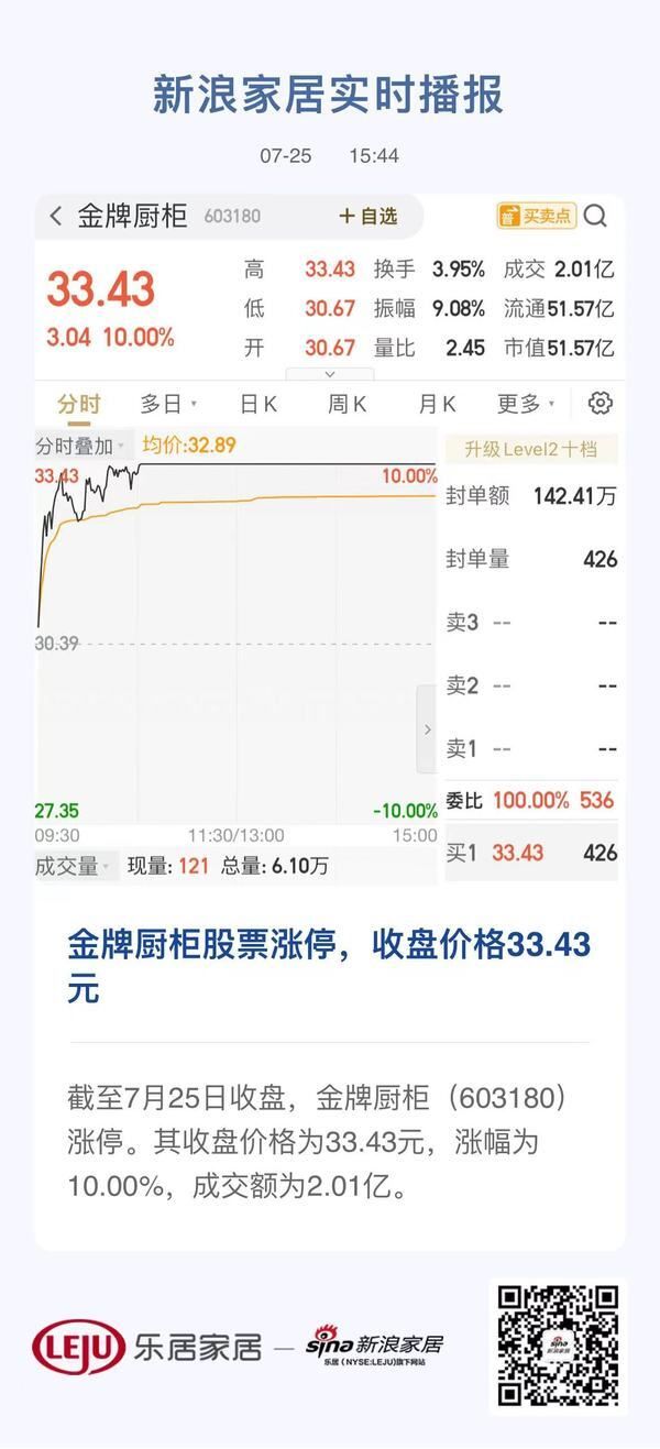 截至7月25日收盘,金牌厨柜(603180)涨停。其收盘价格为33.43元,涨幅为10.00%,成交额为2.01亿。