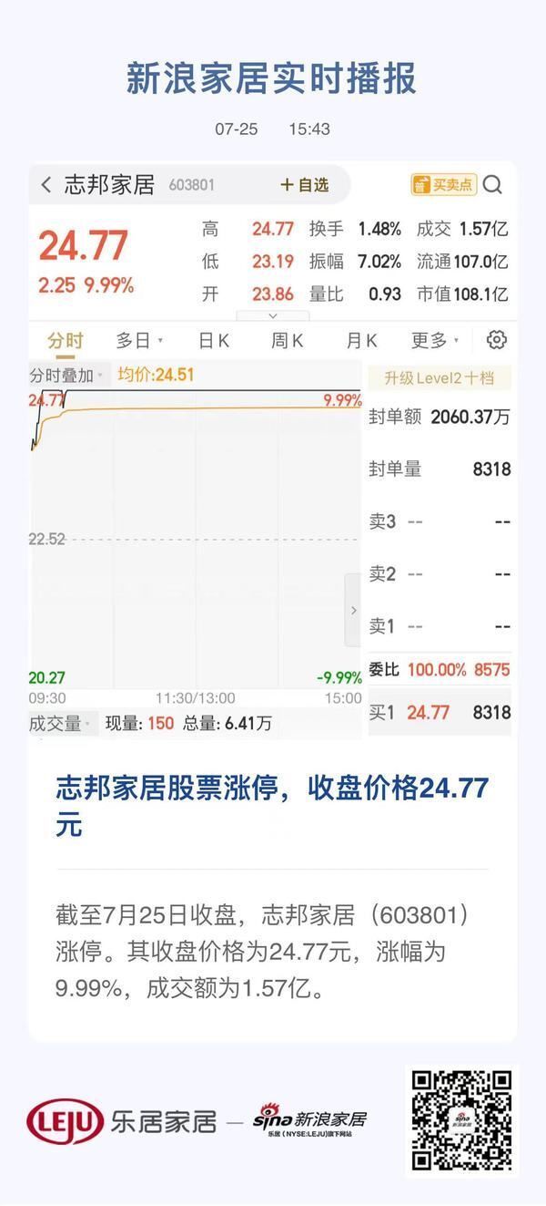 截至7月25日收盘,志邦家居(603801)涨停。其收盘价格为24.77元,涨幅为9.99%,成交额为1.57亿。