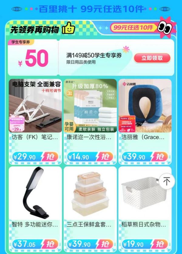 为了让学生们省钱焕新,京东开学季特设“百里挑十 ”专区,杂物收纳篮、笔记本电脑支架、泡脚盆、毛巾、水果刀、除螨喷雾等刚需好物99元任选10件,更有搬家打包收纳袋、真空压缩包、抽屉式桌面收纳盒、衣服收纳筐等海量商品享低至5折的学生折扣,为学生们带来超值优惠。