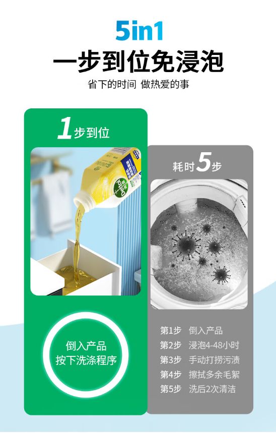 滴露这款洗衣机清洁除菌液没有机型限制,适用于各种洗衣机的机型。使用起来也非常的方便。用的时候并不需要浸泡,倒一瓶滴露洗衣机清洁除菌液到洗衣机添加口或桶内水中,直接正常开启洗涤模式即可,两个步骤就能还你一个干净如新的洗衣机。如果想让洗衣机变得更加干净,也可以先将一瓶盖的滴露洗衣机清洁除菌液与200ML水稀释后,用毛巾手动给洗衣机水流去不到的地方先进行擦拭,再进行以上步骤,保证让洗衣机的边边角角也干净如新。