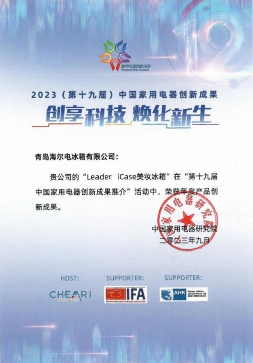 9月1日,Leader iCase小仙贝美妆冰箱凭借首创的底部制冷科技和智慧管理功能,斩获第十九届中国家用电器创新成果发布盛典“年度产品创新成果奖”,成为行业首个获得此奖项的美妆冰箱。