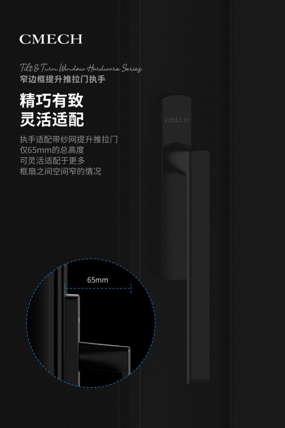 最近,CMECH希美克以高品质的原材料为基础,配合创新外观性能设计以及精简制造工艺,推出了一套美观与功能兼具的窄边框提升推拉门系列执手。