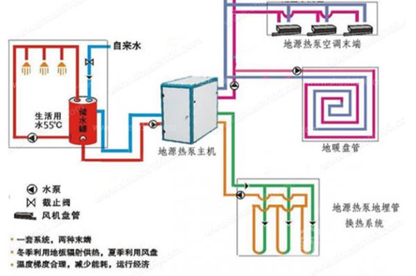 其中地源热泵机主要有两种形式:水—水式或水—空气式。三个系统之间靠水或空气换热介质进行热量的传递,地源热泵与地能之间换热介质为水,与建筑物采暖空调末端换热介质可以是水或空气。