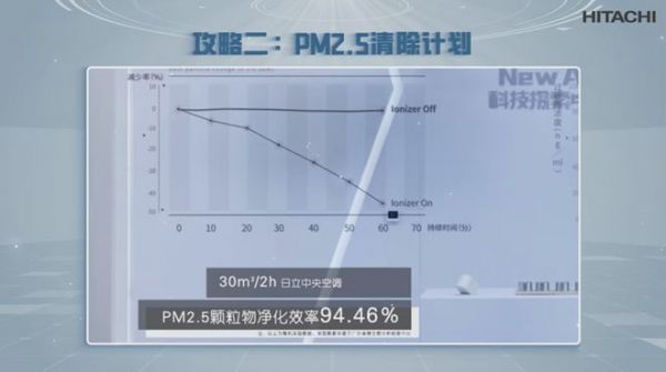 日立中央空调搭载的PE纯净生态模块通过施加高压电极实现对房间空气环境的高效净化,仅需15分钟即可将PM2.5降至标准水平,空气中PM2.5含量由273μg/m³下降至87μg/m³。30m³/2h日立净化中央空调PM2.5颗粒物净化效率94.46%,家居环境更洁净安全。