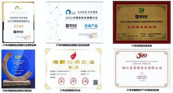 在助力行业发展的同时,便洁宝也以其品质和口碑,赢得了众多荣誉。如“全国感应洁具十强企业”、智能马桶“浙江制造”首张认证、“浙江省知名商号”“浙江省名牌产品”“红棉设计奖”“台州市政府质量奖”“红顶奖提名奖”等。