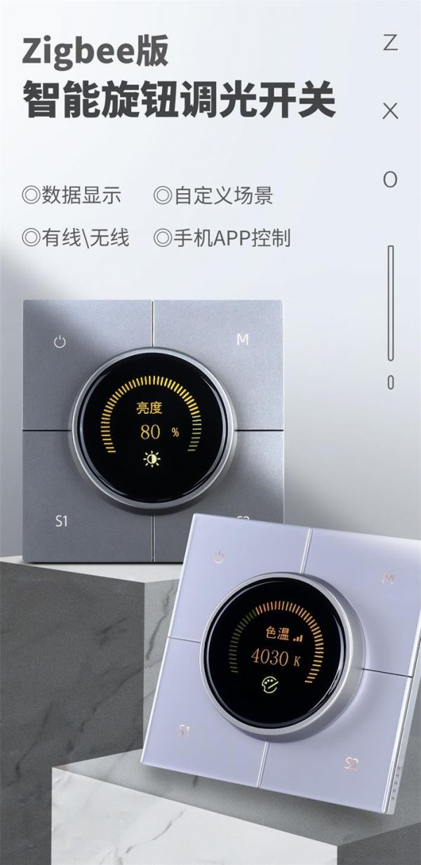 它搭载ZigBee3.0技术,用户可预设触发动作及情景。1、自由选单击、双击、顺时针等动作;2、添加被控设备,设置多种场景模式。