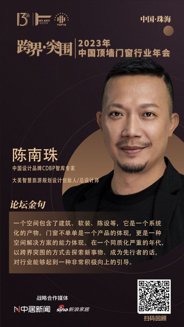 中国设计品牌CDBP智库专家、大美智慧旅游规划设计创始人/总设计师陈南珠在主题论坛环节中表示:一个空间包含了建筑、软装、陈设等,它是一个系统化的产物。门窗不单单是一个产品的体现,更是一种空间解决方案的能力体现。在一个同质化严重的年代,以跨界突围的方式去探索新事物、成为先行者的话,对行业能够起到一种非常积极向上的引导。