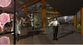 将餐厅和博物馆的建筑类型融合在一起,拥有独特的空间布局,为客人叙述关于市场猪只解剖学、生活和烹饪文化的知识。