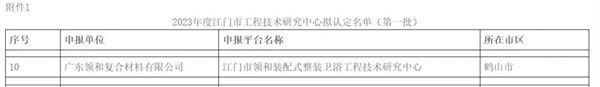 近日,根据江门市科学技术局《2023年度江门市科技创新平台(第一批)立项公示》文件,领和“装配式整装卫浴工程技术研究中心”成功入选江门市科技创新平台!