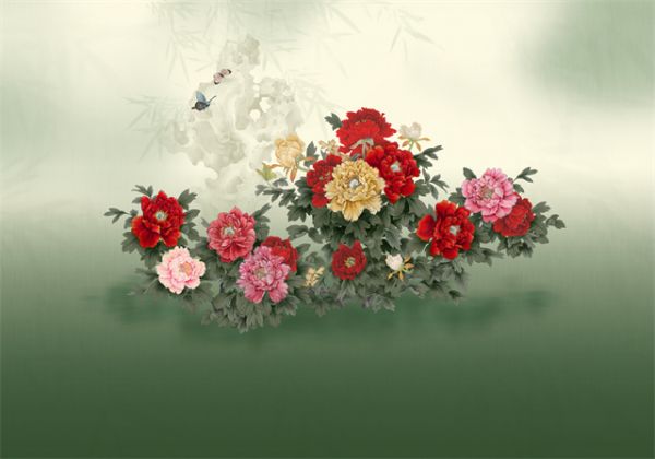 牡丹、太湖石、竹相互交融