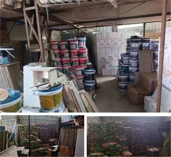 达州宣汉查处1个售假门店,查扣德高克迪聚合背胶32桶,德高克迪瓷砖胶740包。