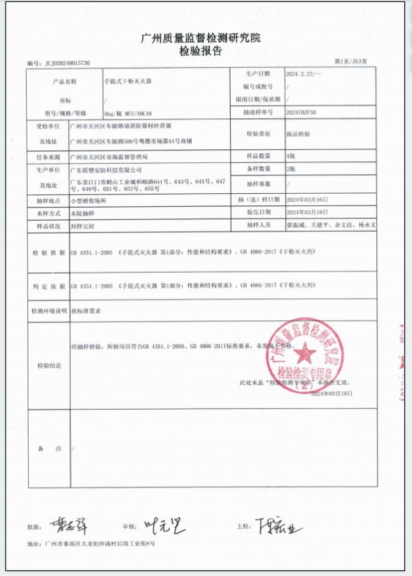 本次行动抽查涉及的商家较多,抽样量较大,广州质量监督检测研究院也陆续完成抽样抽查检测报告,在大量的检测报告中,我们发现抽查送检的样品中涉及到联塑消防产品全部合格。其被抽样送检的产品在各项关键指标——包括质量、20℃温度喷射性能试验、水压试验、爆破试验,以及灭火剂和驱动气体中干粉灭火剂第一主要组分含量测定等检验项目,全部表现达标合格,符合GB4351.1-2005和GB4066-2017国家强制性标准,未发现不合格。