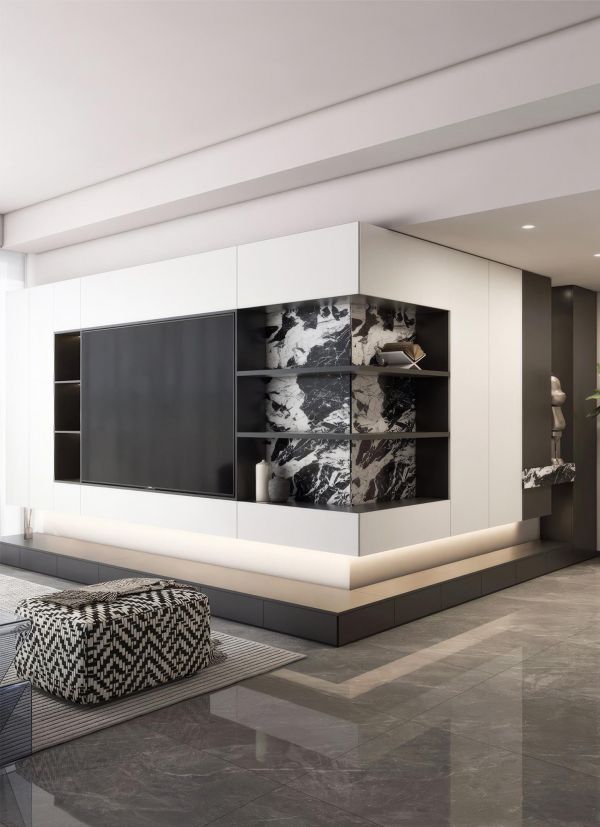 色彩与材质:整个客厅的色彩搭配协调而富有层次感,黑色、白色、灰色以及大理石的纹理等元素的运用使得空间既现代又不失温馨。材质上,从电视柜的坚固木质到壁炉的大理石纹理再到沙发的柔软织物,都体现了高品质的生活追求。