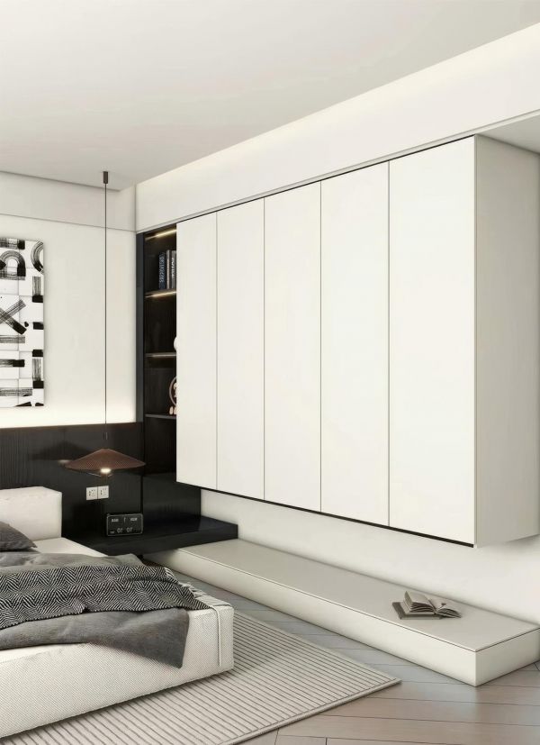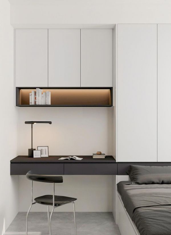 小物件与细节:房间内还散落着一些小物件,如一个白色花瓶和一个圆形的装饰品,它们虽然不起眼,但却在细节处体现了主人的用心和品味。这些物件与整个空间的简约现代风格相协调,共同营造出一个和谐、舒适的居住环境。