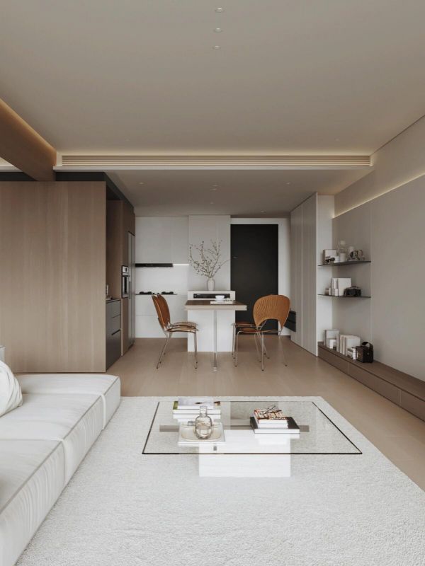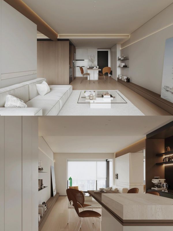 把一个卧室打通后加上开放式厨房,餐厨一体化空间。
