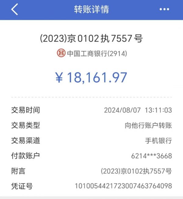 8月7日下午,刘涛按照拍卖规则,向西城区法院的公开账号转款。银行转账记录显示,交易时间是13时11分03秒,金额为18161.97元。
