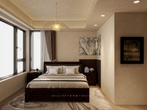 以舒适为主,床品和装饰延续了新中式的风格,简约而不失雅致。设计师大量运用了陶瓷、陶罐、木制品、漆器、水墨画等传统中式元素,营造出浓郁的宋式美学氛围。
