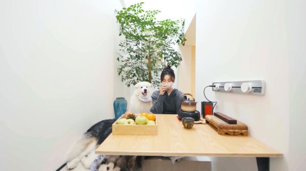 在这里人与动物消融了物理上的隔阂,极简空旷的空间、人与宠物共享的家具等,让狗子可以自由的钻来钻去,人则可以趺坐案几,烹茶读书或者静坐发呆。安娜的家,跳脱出了以人类为中心的设计理念,在实践中打造出了一个“人宠共栖”的新范本。