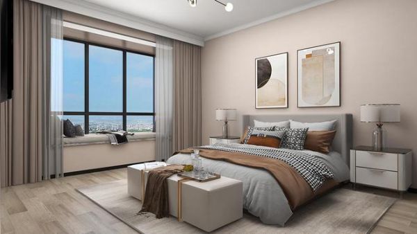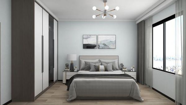 主卧选择的暖色系背景墙,阳台上下也是使用了墙布,质感柔软,灯光也是选择了较为简洁的吊灯,温馨时尚感十足。得益于大空间的优势,主卧还添加了简单的柜体,可以放置物件,也可以用来作为简单的“小吧台”,情调感满满。
