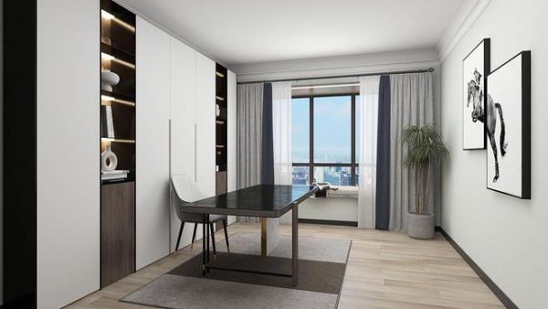 书房对光线和隔音的要求比较高,所以墙面装饰也是选择了简单的浅水绿墙布与装饰画,致力于宁静又不失雅致,搭配木纹地板与地毯,也是极大的给予居者更加安静自然的环境。而且书房在日后有需求时,还可以重新设计成儿童房,整体相当便利。