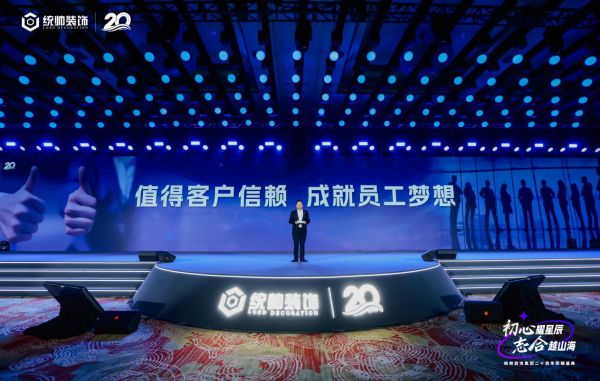 站在统帅装饰20周年庆典的聚光灯下,董事长杨海握话筒的手微微发颤。台下坐着一千多人——从创业初期跟着他铺水电管道的老师傅,到刚通过“同辰学堂”考核的00后设计师。身后的大屏上,庆典主题「初心耀星辰·志合越山海」熠熠生辉,杨海的声音穿过掌声:“真诚、极致是统帅装饰的行动准则”“我们要让装修变成一件简单的事”……