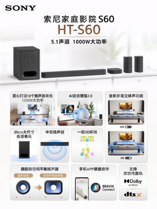 作为一款物理5.1实体声道的家庭影院系统,HT-S60拥有1000W强大功率输出,配备大口径无线低音炮,同样支持杜比全景声与DTS:X音频格式、空间平衡扬声器以及一键3D上混技术,使用源自A系列回音壁的同款硬件,还原影院级震撼声压和优秀的空间定位感。