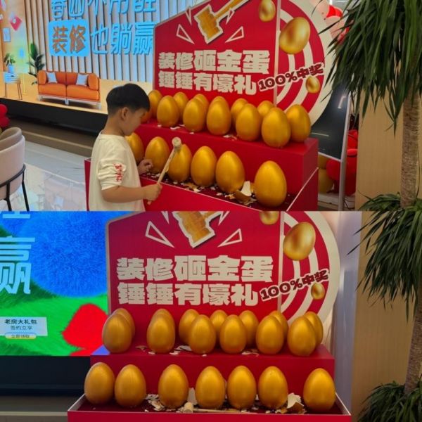更有砸金蛋环节,抽取一线大牌家居奖品,有洗烘一体机、50寸液晶电视、空调、热水器等奖项。数十枚金光闪闪的巨型金蛋整齐排列,在聚光灯下折射出诱人光芒。随着一声一声清脆的"砰"响,中奖业主高举奖券欢呼雀跃,此起彼伏的金蛋爆裂声与欢呼声,将活动现场氛围推向一波又一波高潮。