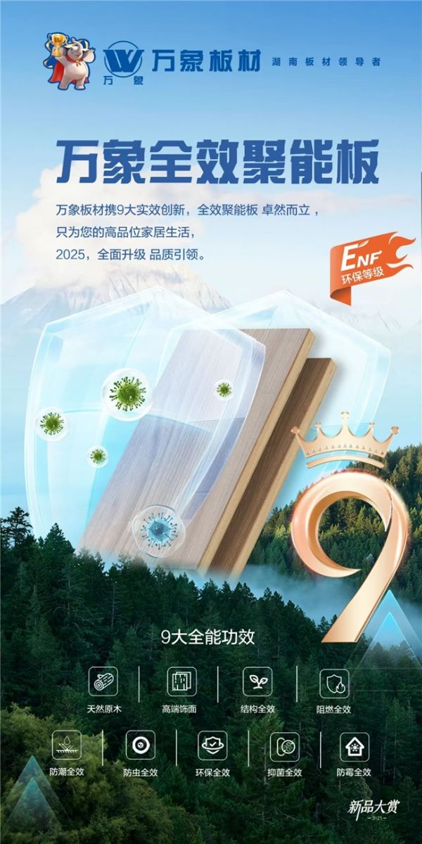 1999年9月1日,万象品牌成立,2002年,旺德府集团产品创新研究所研发了省内木制品行业第一张对甲醛含量有控制的板材;2004年,万象E0级板材问世作为中国环保板材领域的拓路先锋。万象持续以创新为引擎,在关键技术领域实现重大突破,不断推动行业标准向更高维度跃升,持续为消费者创造健康环保的家居解决方案,当之无愧成为“湖南板材领导者”。