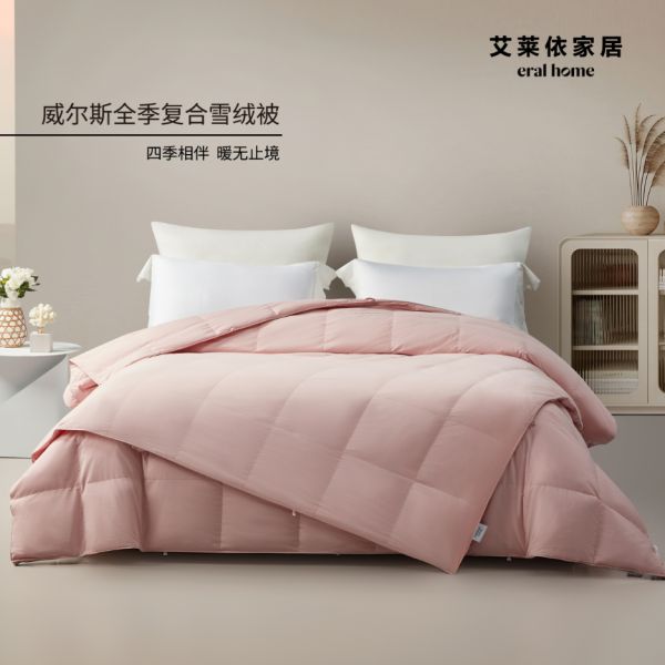 艾莱依威尔斯全季复合雪绒被,甄选生态养殖的番鸭绒,每一朵绒朵均经多道深层水洗净化,洁净低敏、蓬松持久,带来远超国标的蓬松与洁净。被面选用专业研发的卡夫特轻音面料,触感绵软细腻,翻身无噪,守护你与伴侣的静谧夜晚,不惊扰每一刻深眠。创新子母扣设计,一被双芯,春夏单盖轻盈透气,秋冬复合锁温保暖,一被应对全年气候,省空间、易打理。细节见证用心,被头特别加密处理,紧密贴合肩颈,有效防止冷风钻入,一夜温暖不离身,体贴每一个安睡时分。两款优雅配色可选,温柔知性的樱花粉,内敛沉稳的极致灰,融入现代卧室风格,打造属于你的舒适空间,静享四季安睡。