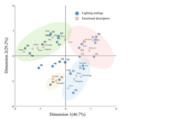 灯光与情绪词汇的“情绪地图”,距离越近代表关联越强
