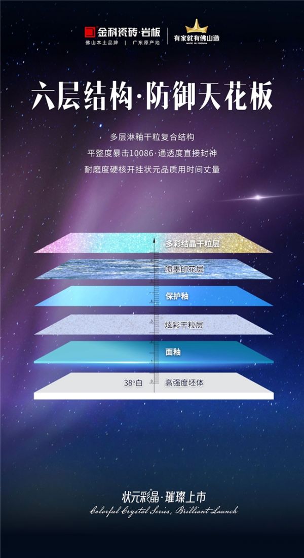 “状元彩晶”系列之所以能够斩获行业权威认可,其核心在于拥有国家发明技术专利的“多彩闪光抛釉砖”工艺(专利号:ZL2025 1 0146765.4)。该专利技术通过分层布施制作工艺,在瓷质板材坯面装饰层的透明层之下,布设多层、多种不同颜色的闪光晶粒,实现表面镜面平整无瑕疵,且晶粒在透明层覆盖下呈现出更加丰富、炫丽的闪光效果,突破传统瓷砖色彩单一、光感呆板的局限。
