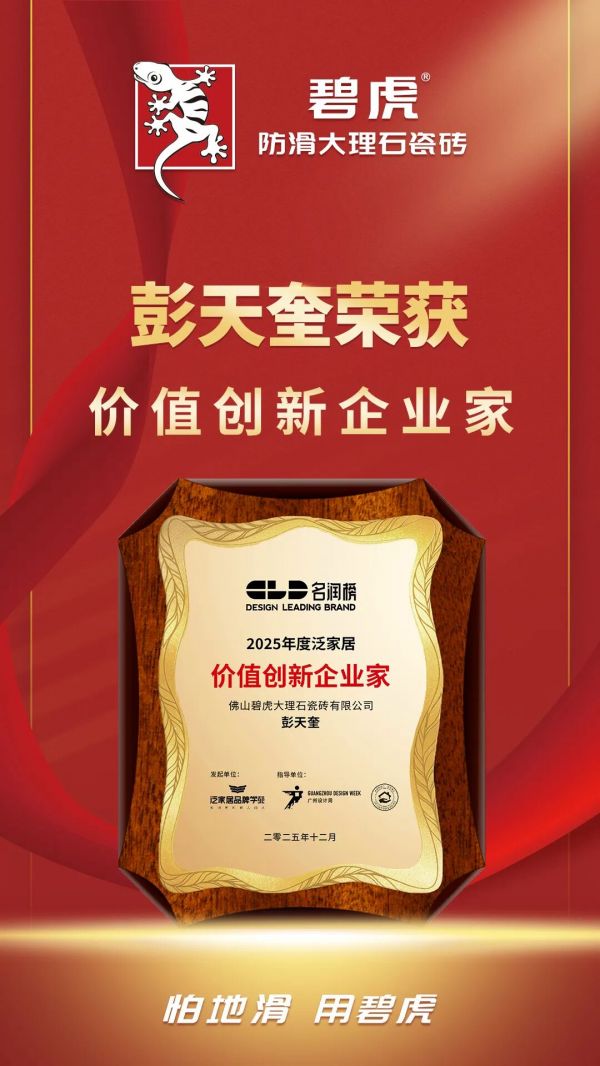 除了展位人气爆棚,碧虎再添重磅荣誉。在泛家居品牌大会暨名润榜颁奖典礼上,碧虎创始人彭天奎,凭借在超防滑瓷砖赛道的创新精神与突出贡献,一举斩获《价值创新企业家》荣誉称号。